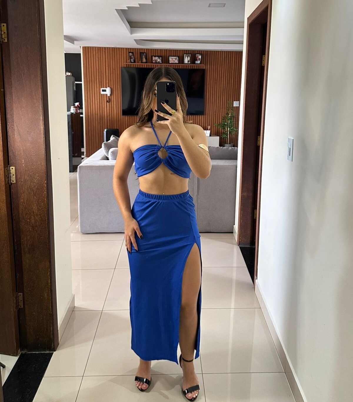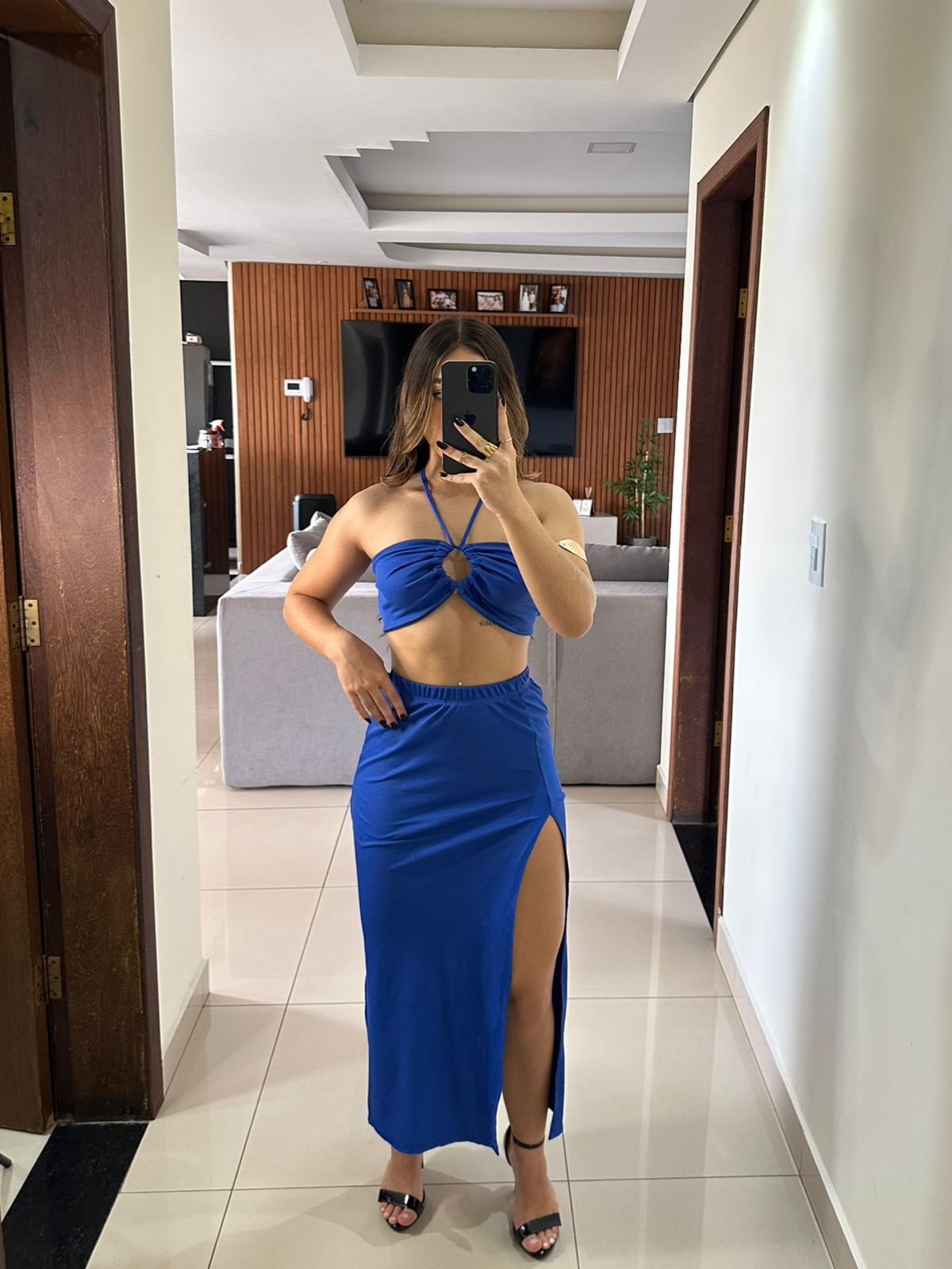 Top tomara que caia com amarração frontal, formando um nó central que valoriza o busto e traz um toque sexy na medida certa, saia longa com fenda lateral alta, que alonga a silhueta e garante movimento e sensualidade ao look.