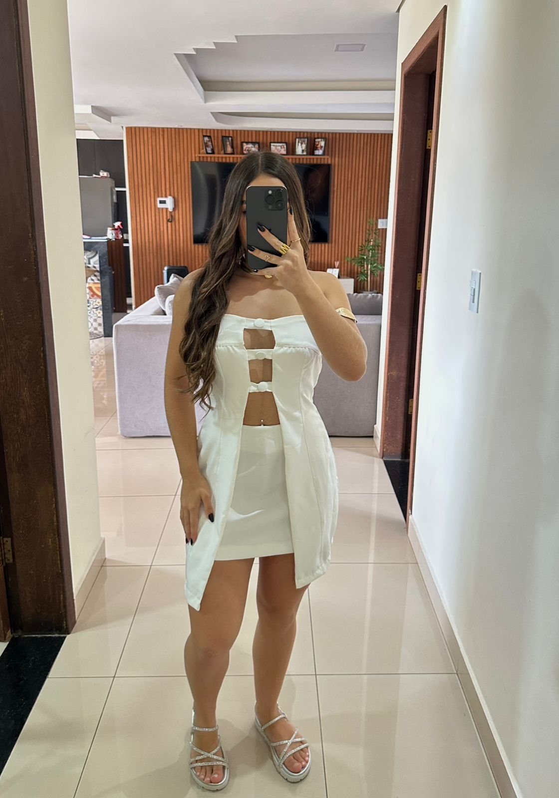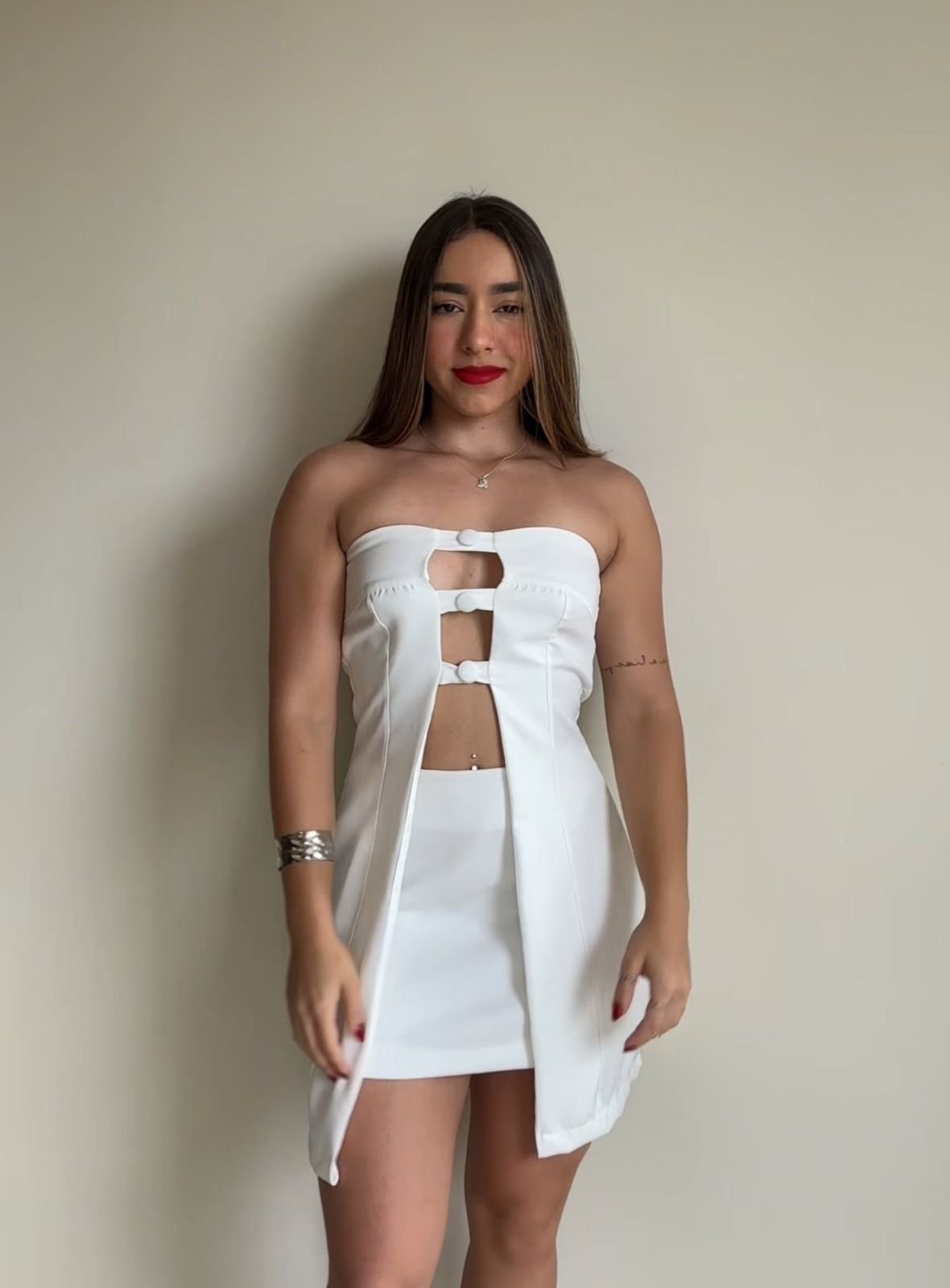 O destaque fica por conta do top com recortes geométricos, que traz um toque ousado e feminino na medida certa, valorizando o corpo com elegância. Perfeito para quem ama um visual refinado, mas cheio de atitude!