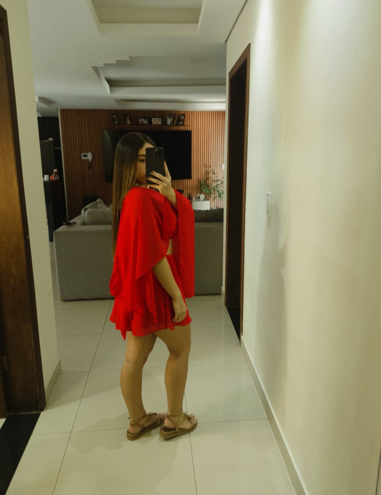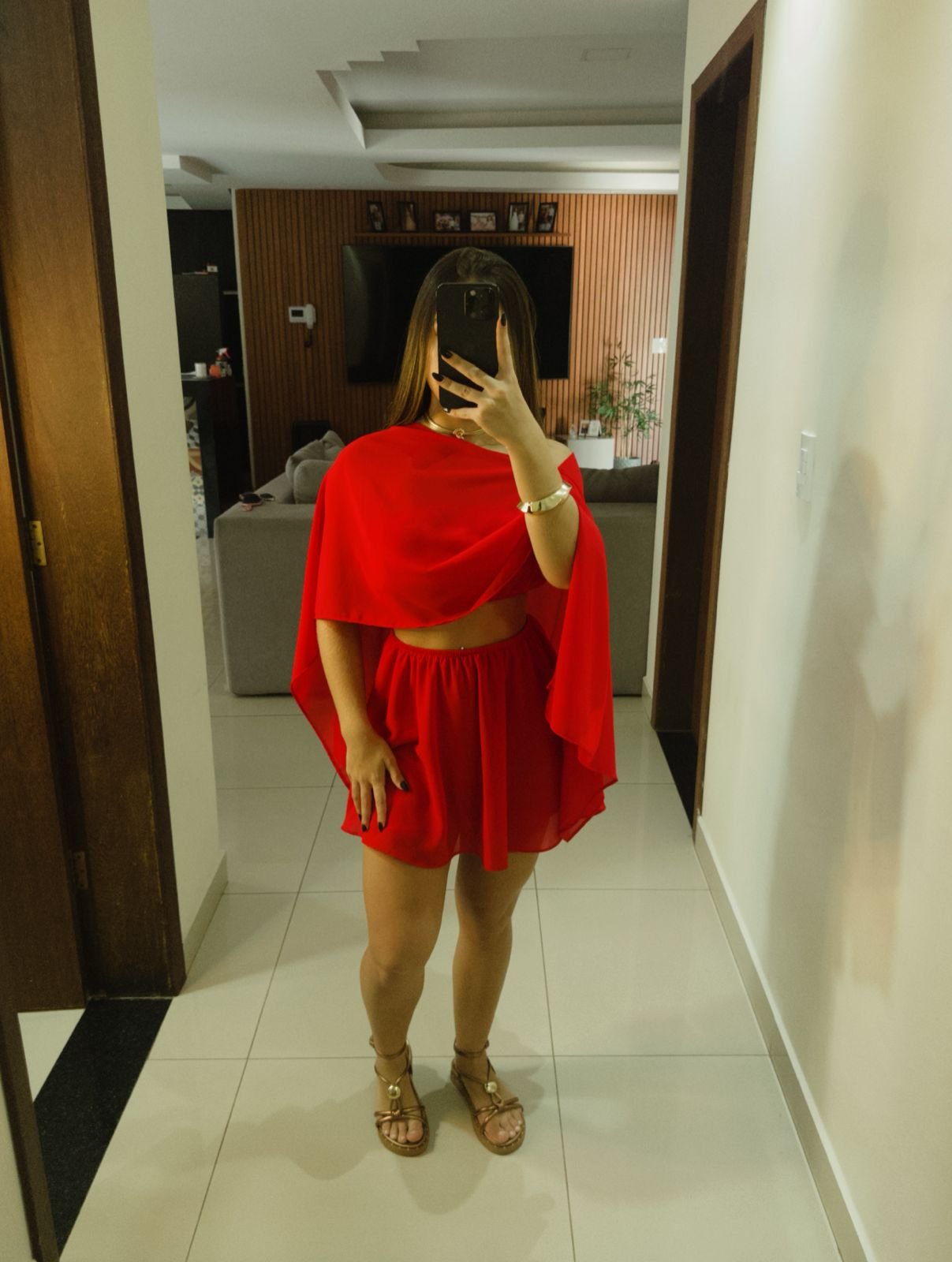 Conjunto Vermelho, super em alta o modelo, contem 3 peças, 1 faixa, 1 saia com shorts em baixo, 1 bata transparente, otima opção para o natal.