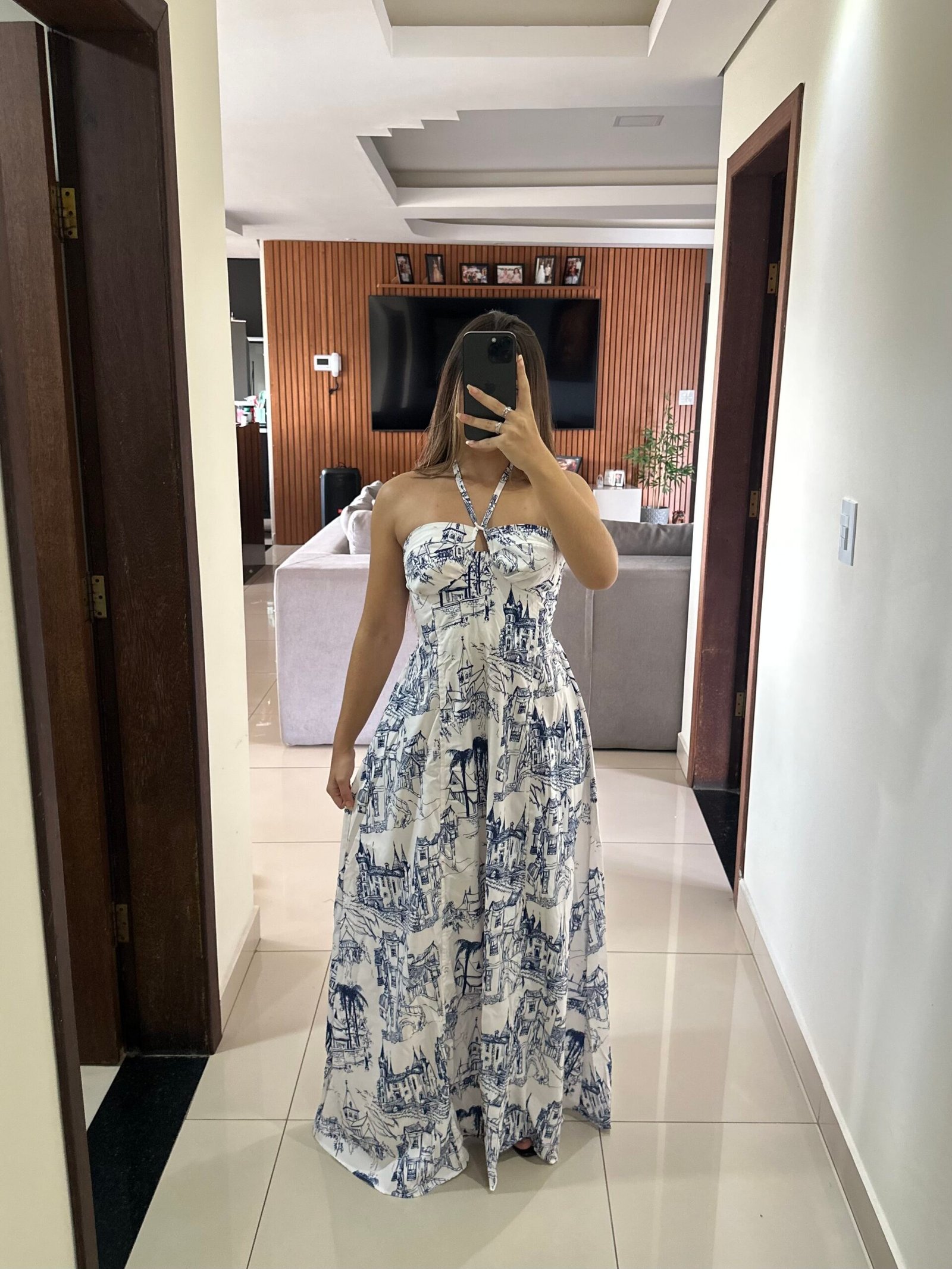Vestido longo em tom off-white com estampa em azul, trazendo um visual clássico e elegante. O modelo possui decote tomara que caia com amarração no pescoço (estilo frente única), que valoriza o colo e adiciona um toque delicado ao look.