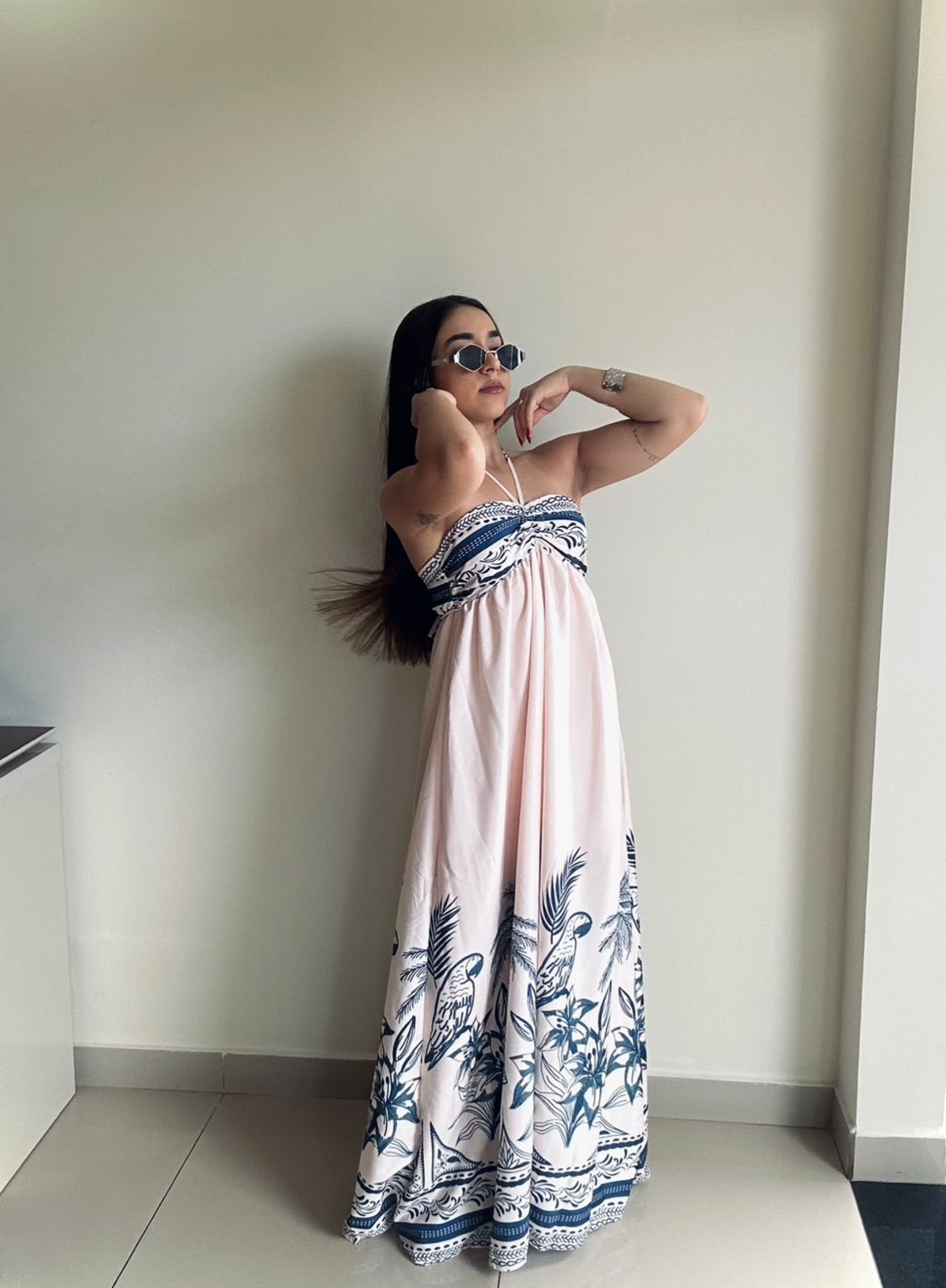 O vestido transmite frescor e elegância, casual perfeito para eventos diurnos, passeios à beira-mar ou ocasiões de verão que pedem conforto com estilo.