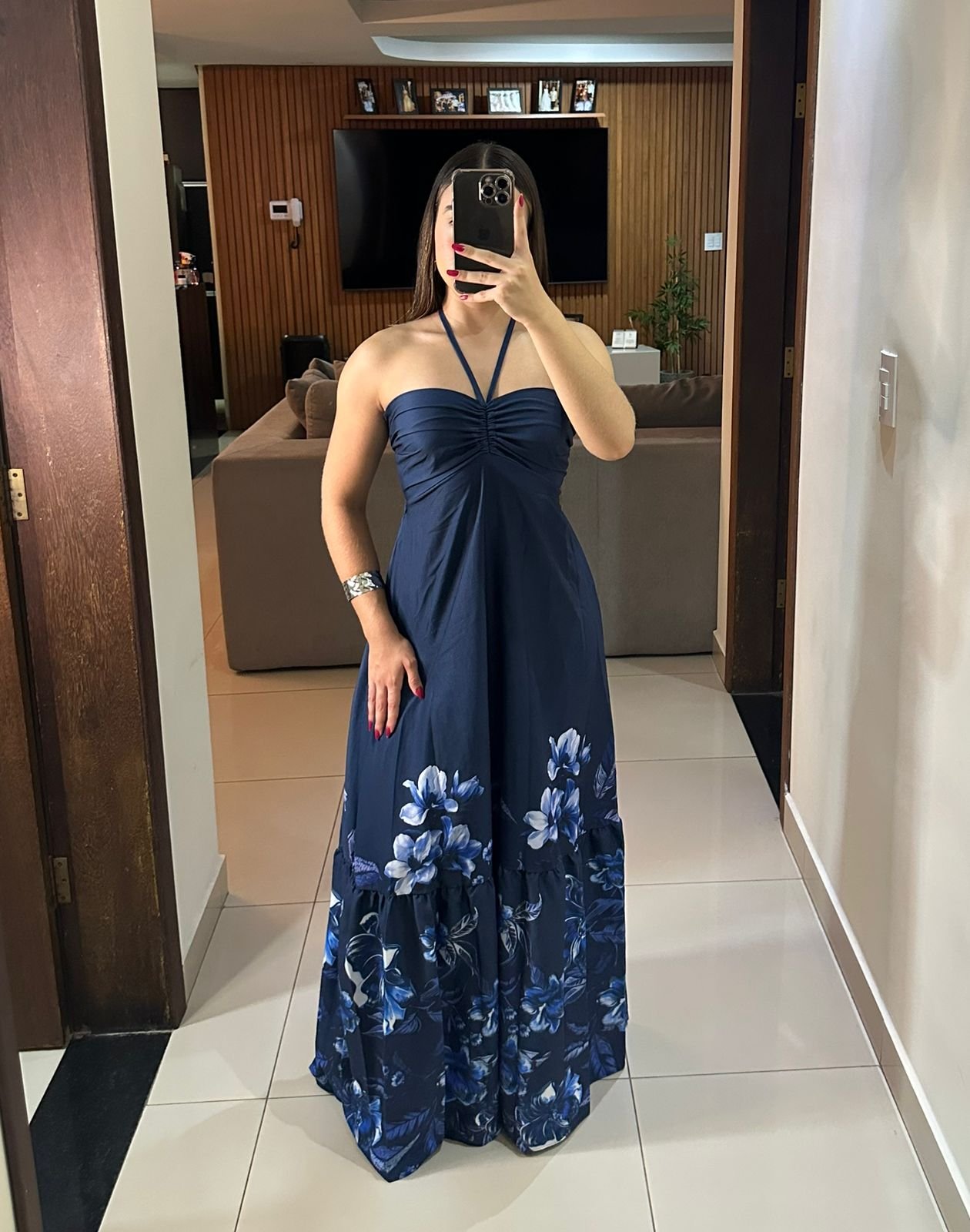Este vestido apresenta um caimento fluido e sofisticado, com um barrado marcado por um lindo print floral em tons de azul e branco, que traz charme e destaque ao visual. O tecido tem aparência leve e estruturada, ideal para eventos sociais, jantares, festas ao ar livre ou ocasiões especiais.